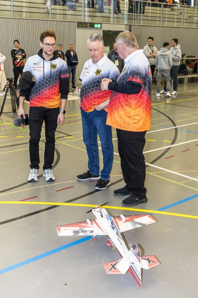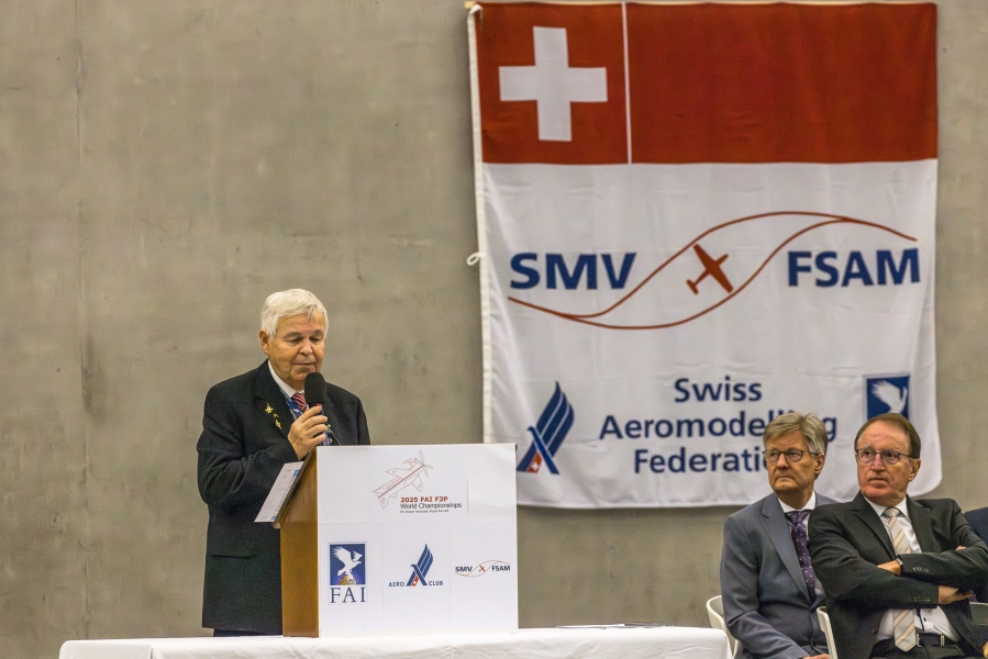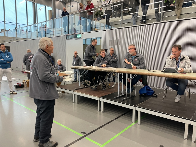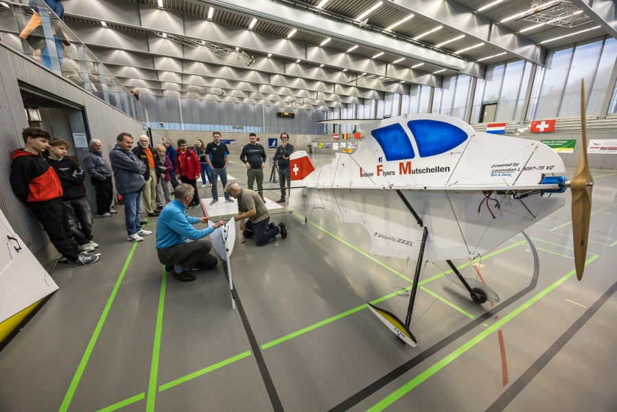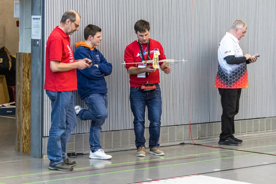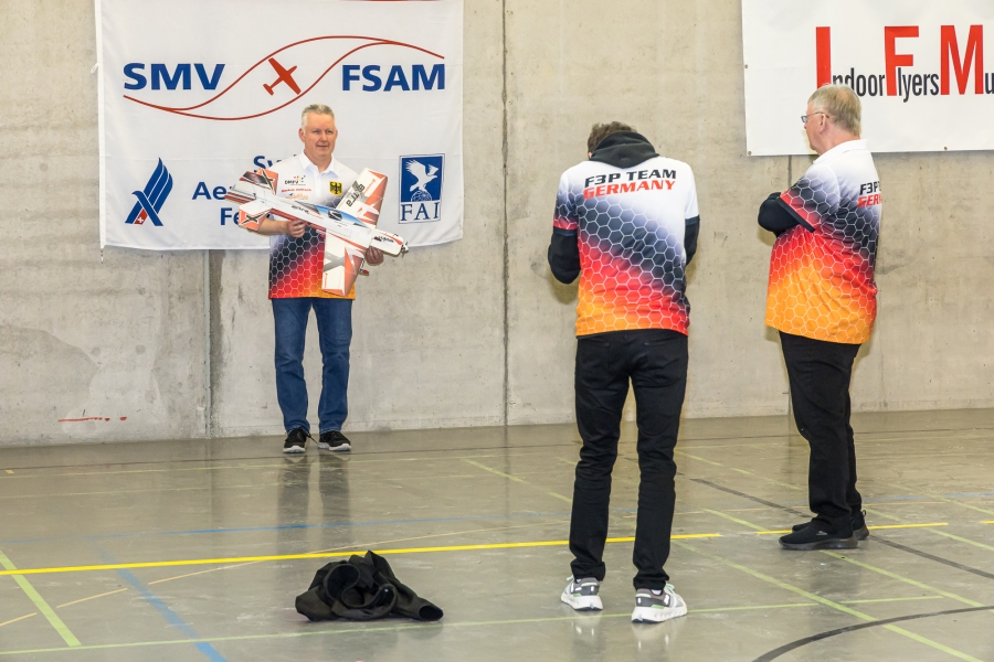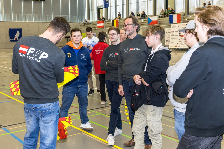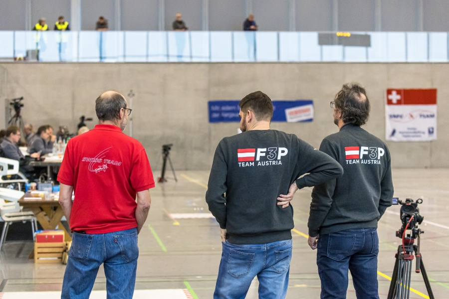 Sonntag, 2. Februar 2025 / Training und Eröffnungsfeier Alle 31 Piloten der Kategorie F3P-A hatten heute nochmals Gelegenheit während eines Trainingsflugs die Hallen kennenzulernen und sich ihre Richtpunkte zu setzen. Die Heizung der Sporthalle wird übrigens während den Wertungsdurchgänge abgestellt, um unerwünschte Zugluft zu vermeiden. Nur schon kleinste Luftbewegungen führen zu erkennbaren Turbulenzen und somit Abweichungen von der gewünschten Fluglinie. Die Punktrichter wurden mit den technischen Geräten zur Punkteeingage vertraut gemacht, die Teammanager der verschiedenen Länder führten die Auslosung der Startlisten durch. Um 1630 Uhr fand die feierliche Eröffnung der WM mit Alphornklängen und Fahnenschwinger statt, um sich danach bei der Welcome-Party austauschen zu können.