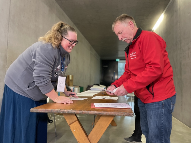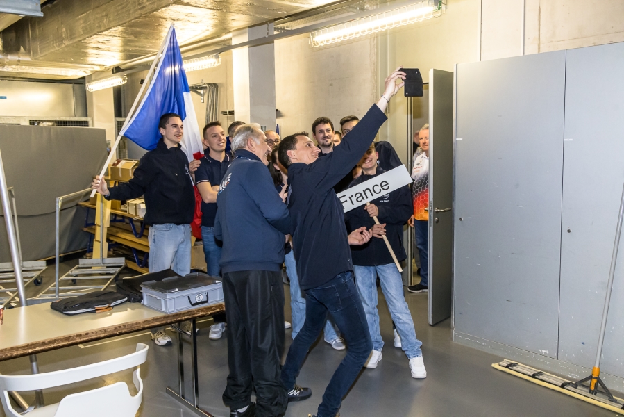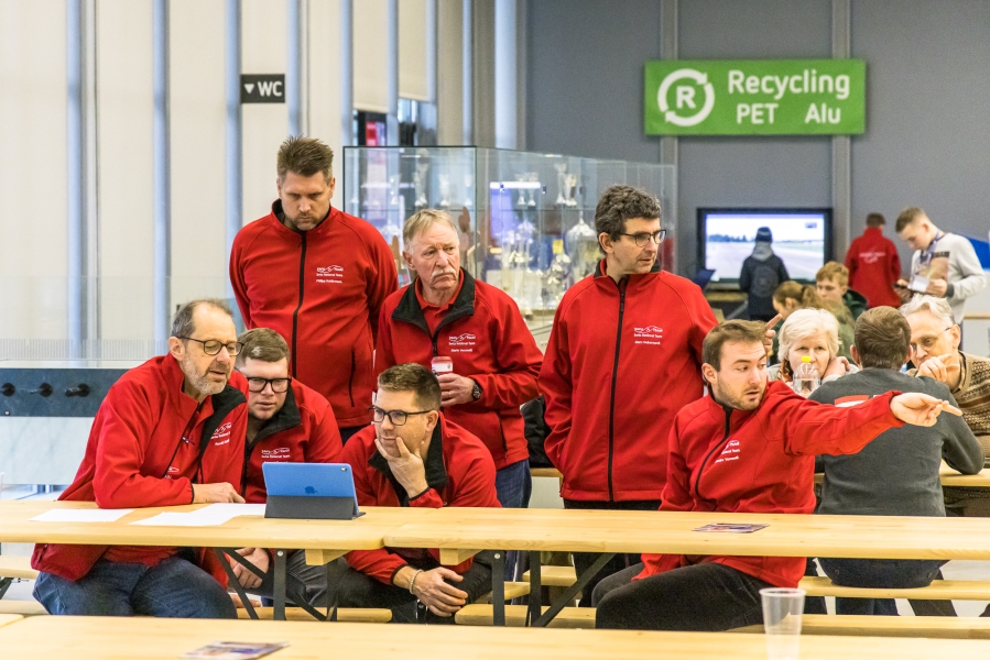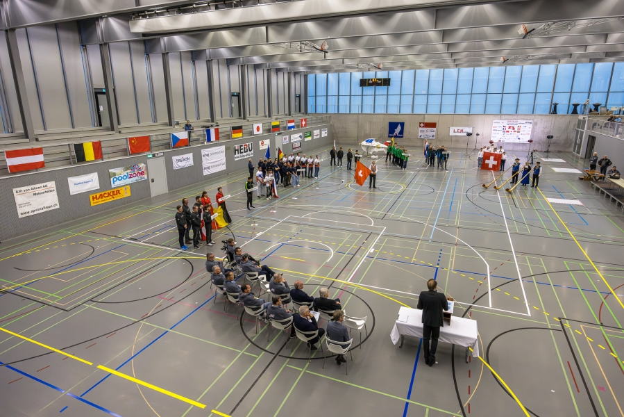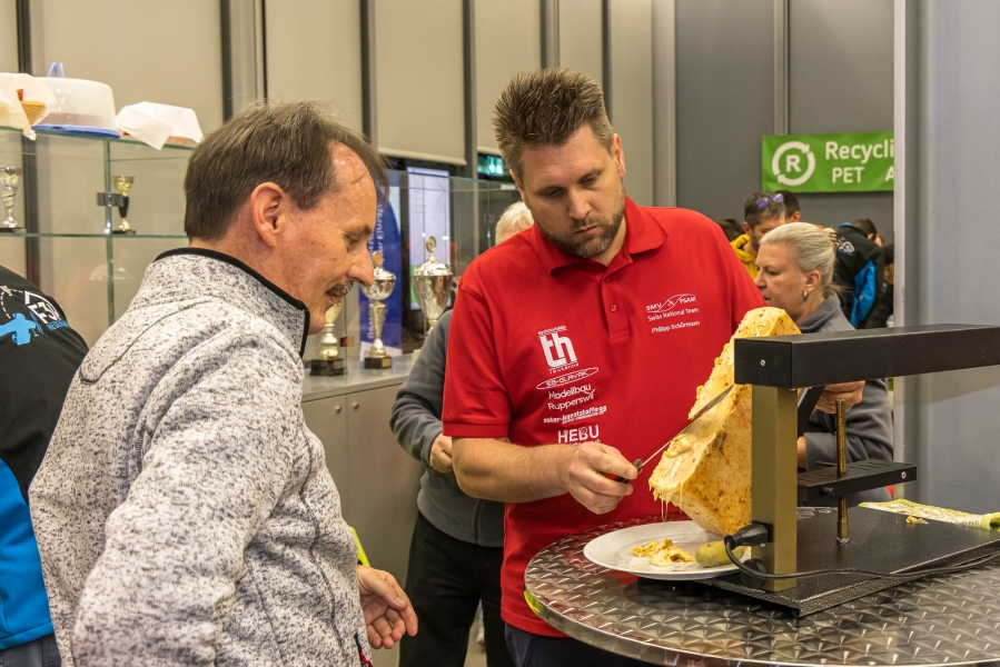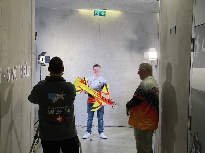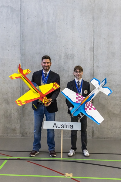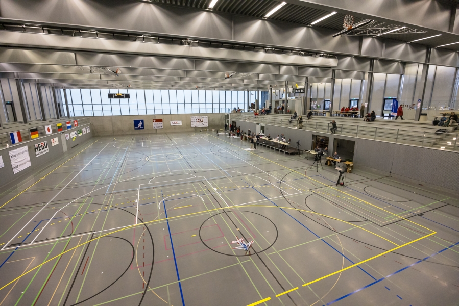 Sonntag, 2. Februar 2025 / Training und Eröffnungsfeier Alle 31 Piloten der Kategorie F3P-A hatten heute nochmals Gelegenheit während eines Trainingsflugs die Hallen kennenzulernen und sich ihre Richtpunkte zu setzen. Die Heizung der Sporthalle wird übrigens während den Wertungsdurchgänge abgestellt, um unerwünschte Zugluft zu vermeiden. Nur schon kleinste Luftbewegungen führen zu erkennbaren Turbulenzen und somit Abweichungen von der gewünschten Fluglinie. Die Punktrichter wurden mit den technischen Geräten zur Punkteeingage vertraut gemacht, die Teammanager der verschiedenen Länder führten die Auslosung der Startlisten durch. Um 1630 Uhr fand die feierliche Eröffnung der WM mit Alphornklängen und Fahnenschwinger statt, um sich danach bei der Welcome-Party austauschen zu können.