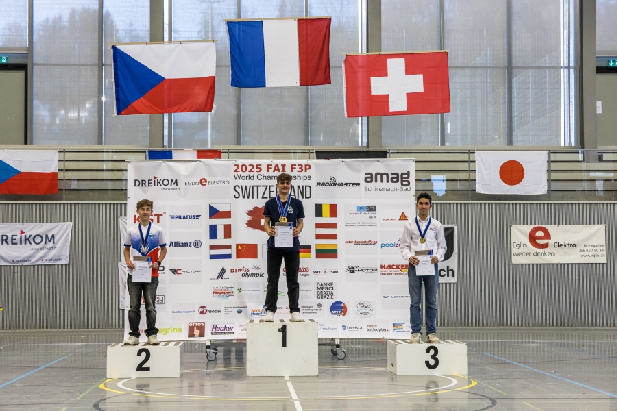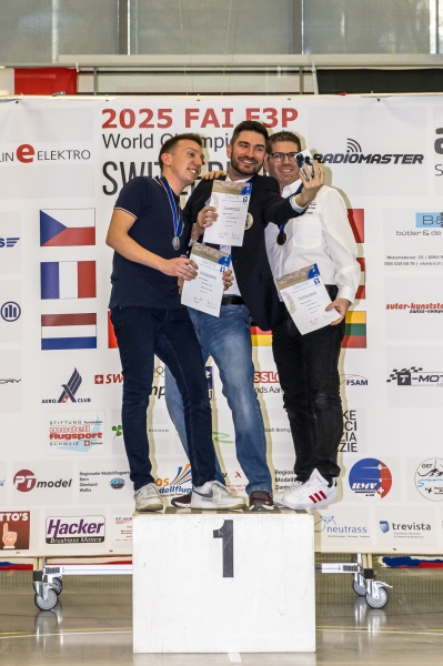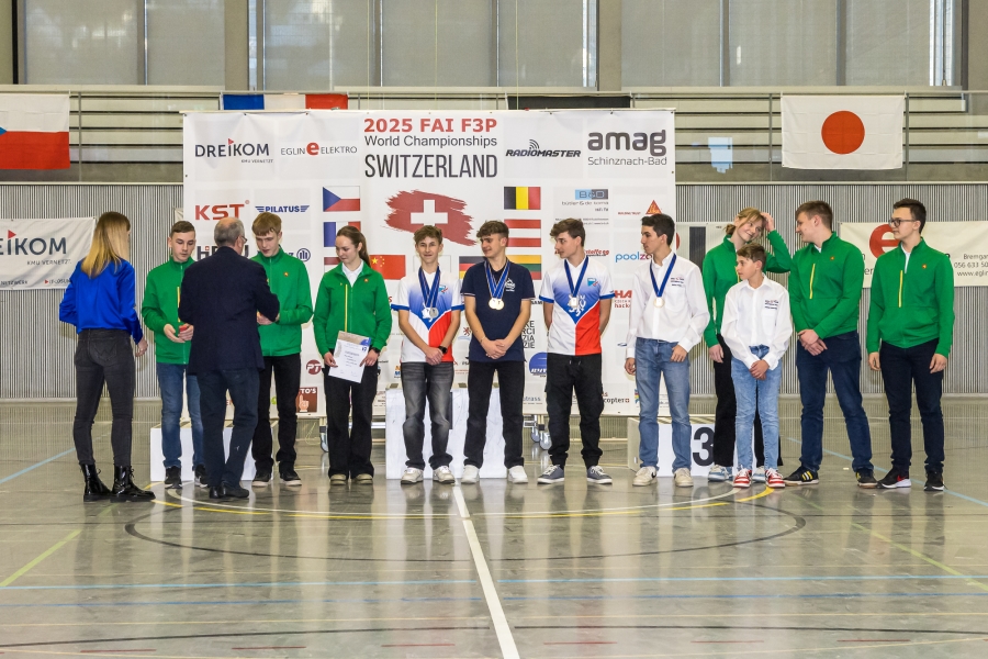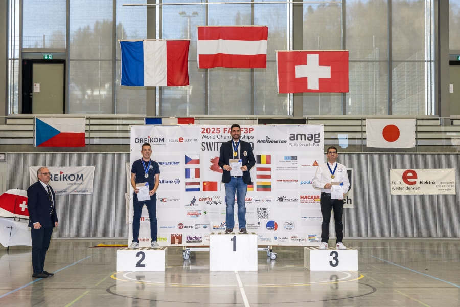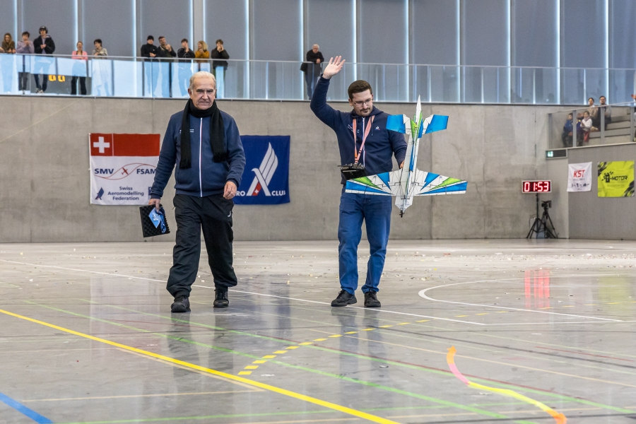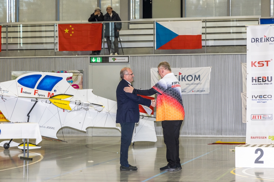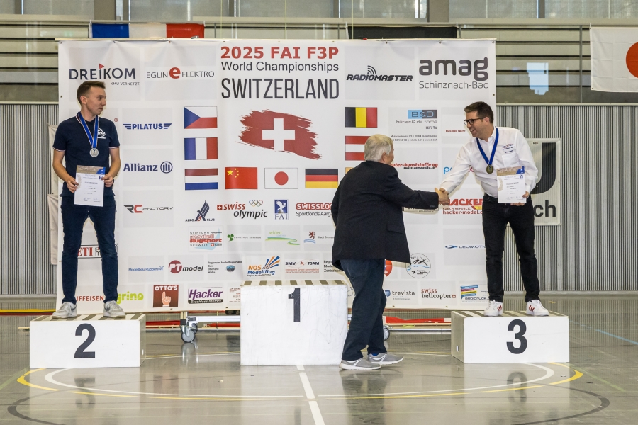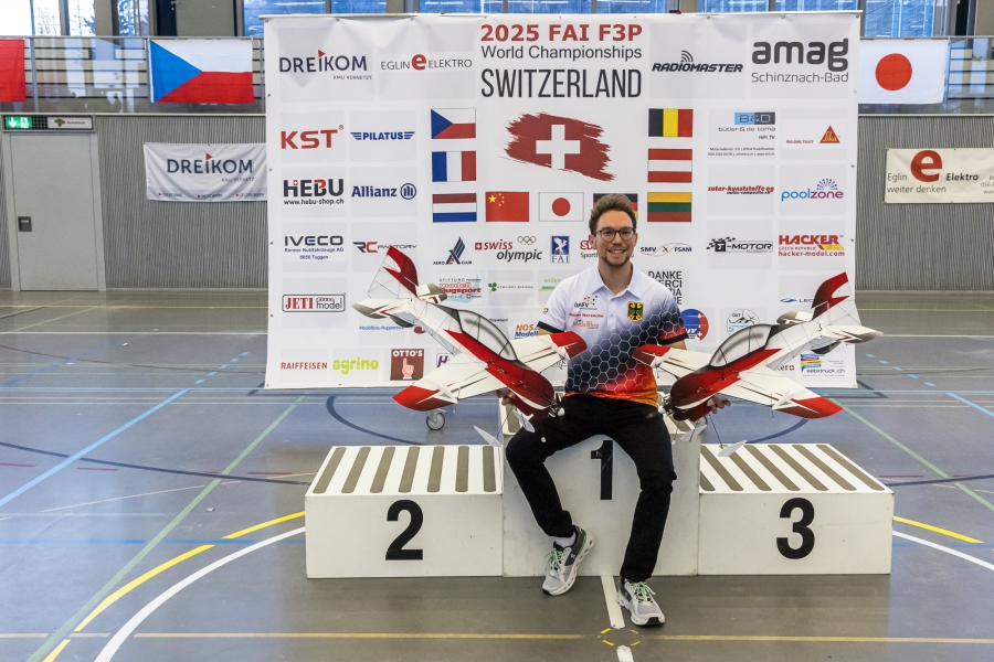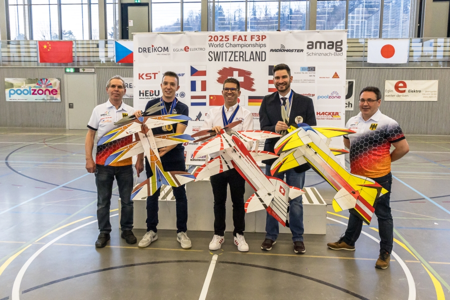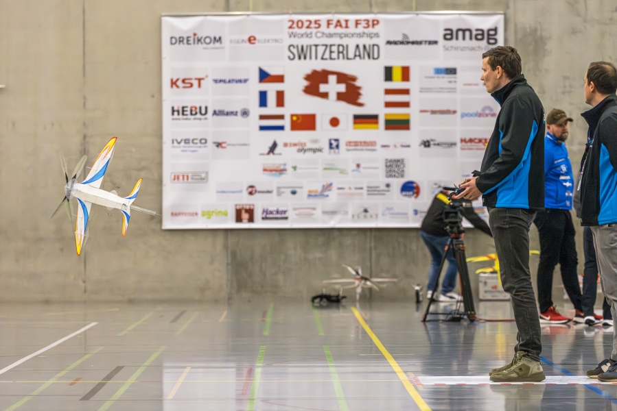 Mit der Siegerehrung und dem Schlussbankett fand die Indoor Kunstflug WM 2025 in Widen AG am vergangenen Samstag ein würdiges Ende. Sylvain Pasini ereichte im klassischen Kunstflug (F3P-A) den 3. Rang und Philipp Schürmann den 5. Rang.