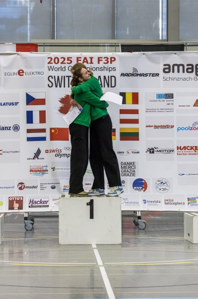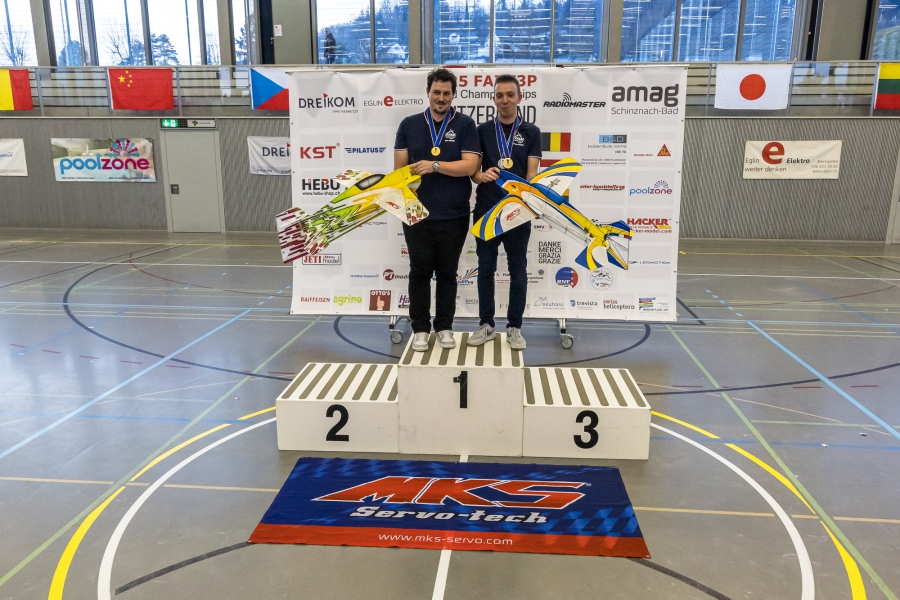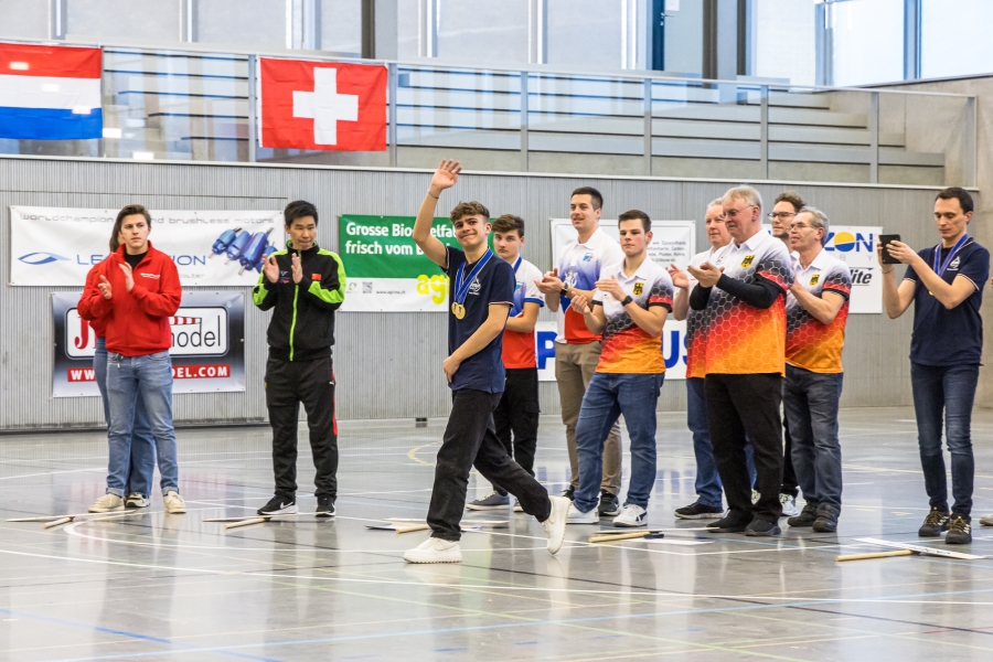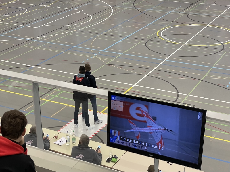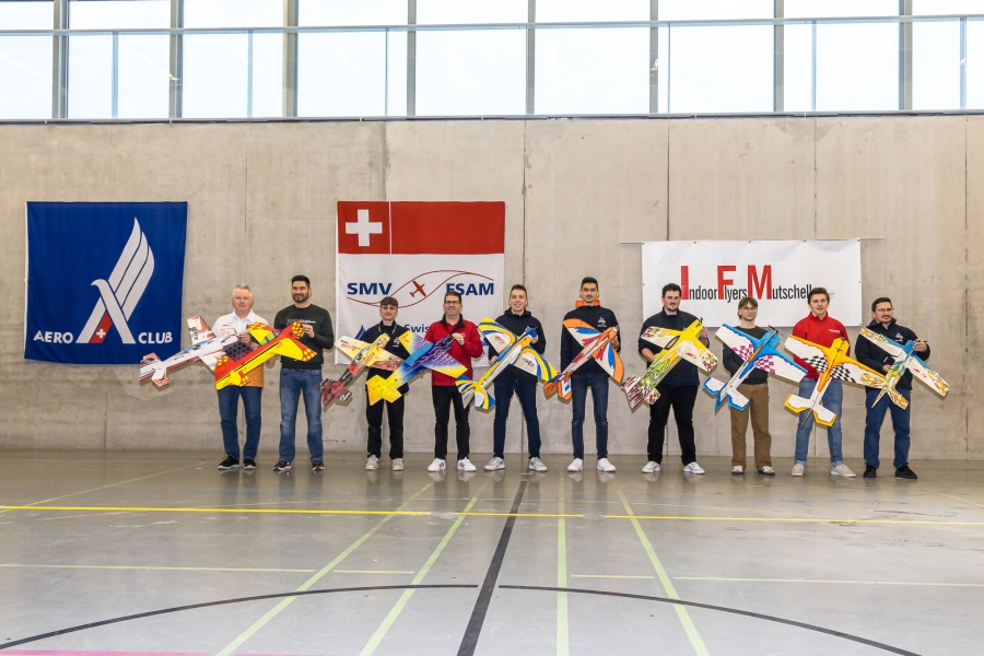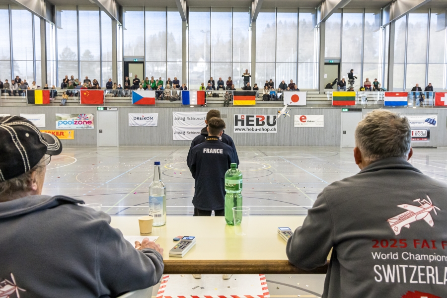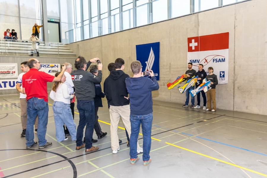 Samstag, 8. Februar / Final AFM / Siegerehrung / Abschlussbankett Vor einer eindrücklichen Zuschauerkulisse fanden die letzten Finalflüge der AFM-Kategorie statt. Dazwischen zeigten die Indoor Flyers Mutschellen verschiedene Schauflüge. Um 1600 Uhr wurden die Weltmeister gekürt: F3P-A Gernot Bruckmann AUT / F3P-AFM Maxime Schmitt FRA / F3P-Teamwertung: Frankreich. Bei den Junioren holte Lucas Poncet FRA beide Junioren-WM-Titel. Die komplettenRanglisten Das Schweizer Team holte die Silber-Medaille in der F3P-Kategorie und Sylvain Pasini Bronze im AFM. Matteo Pasini hollte Bronze bei den AFM-Junioren. Die Piloten zeigten auch in den individuellen Kategorien starke Leistungen: Sylvain Pasini 3. Rang F3P / Philippe Schürmann 5. Rang F3P / Arnaud Carrard 13. Rang F3P / Sandro Veronelli 17. Rang F3P / Sylvain Pasini 8. Rang im AFM / Arnaud Carrard 14. AFM / Matteo Pasini 16. AFM und 4. Rang AFM Junioren / David Jolidon 20. Rang AFM / Joshua Debernardi 24. Rang AFM und 8. Rang AFM Junioren