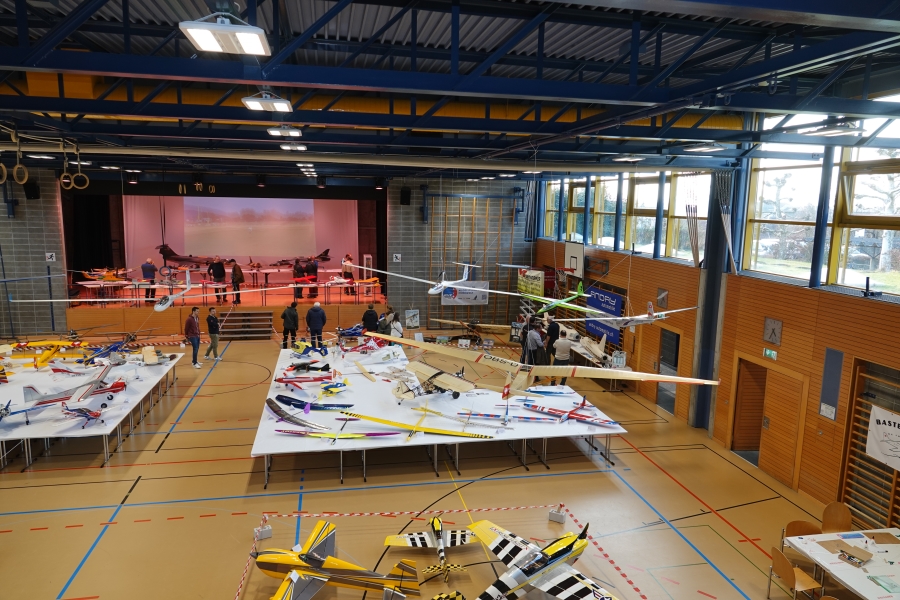 Auf der Hallenbühne wurde die Evolution des Modellflugs dargestellt. Das Modellflugzeug „Dandy“ von Graupner, das in den 1970er Jahren entwickelt wurde, stand dabei ebenso im Mittelpunkt wie Dieter Schlüters erster ferngesteuerter Modellhelikopter, die Bell Huey Cobra von 1970.