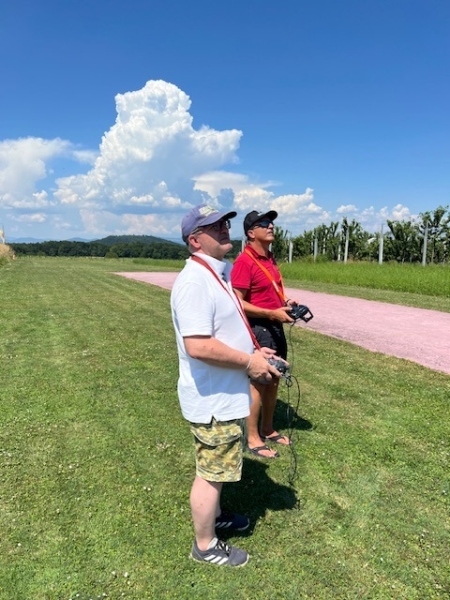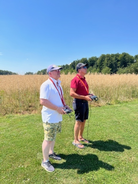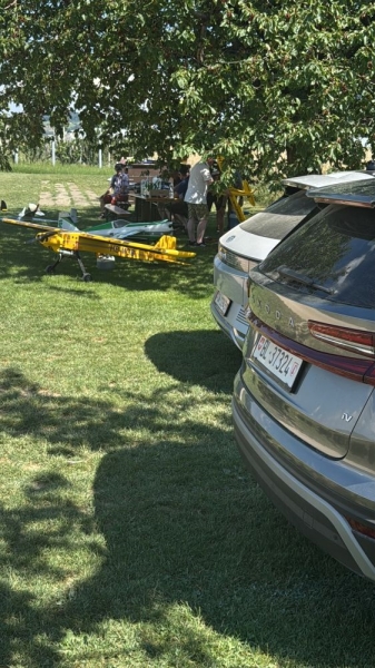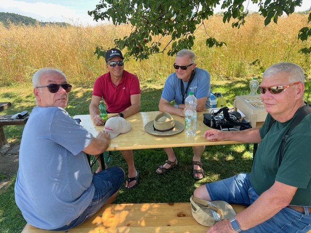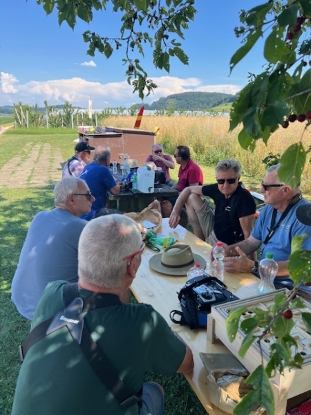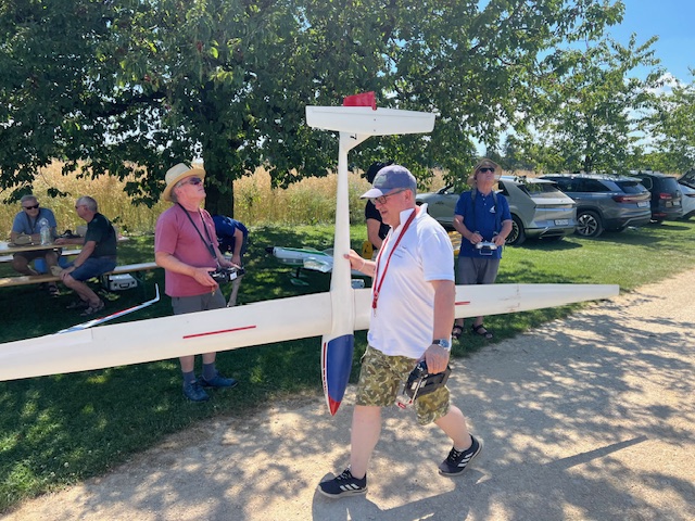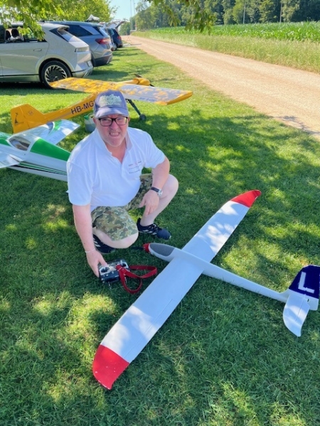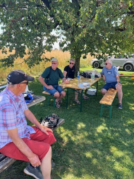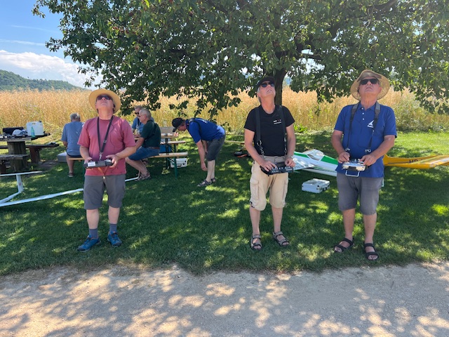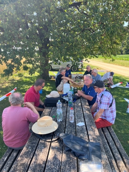 Dieses Mal genossen wir die Gastfreundschaft der MG Breitfeld und ihrem Vereinspräsidenten Dani Reich, sowie dem Regionalpräsidenten der Region Nordwest Roland Voegeli. Mit dabei waren auch der frühere Regionalpräsident Romeo Spaar und der neue AeCS Geschäftsführer, Chrigel Markoff. Chrigel absolvierte seine ersten Modellflüge am Doppelsteuer von Zigi. Er hat es sehr gut gemacht. Roland hat die Segler ohne Antrieb zuverlässig und speditiv in die gute Thermik geschleppt. Wir sind mit Motorflieger und mit E-Seglern geflogen. Die grosse Hitze war dank dem Schatten unter den Chriesibäumen und der Versorgung durch den Verein mit kühlen Getränken und Speckzopf absolut erträglich. Einen herzlichen Dank an die MG Breitfeld, es hat trotz der grossen Hitze grossen Spass gemacht bei und mit Euch zu Fliegen!